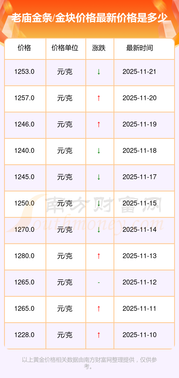 老庙 金条/金块价格在今日的最新价格显示为1253.0元/克。