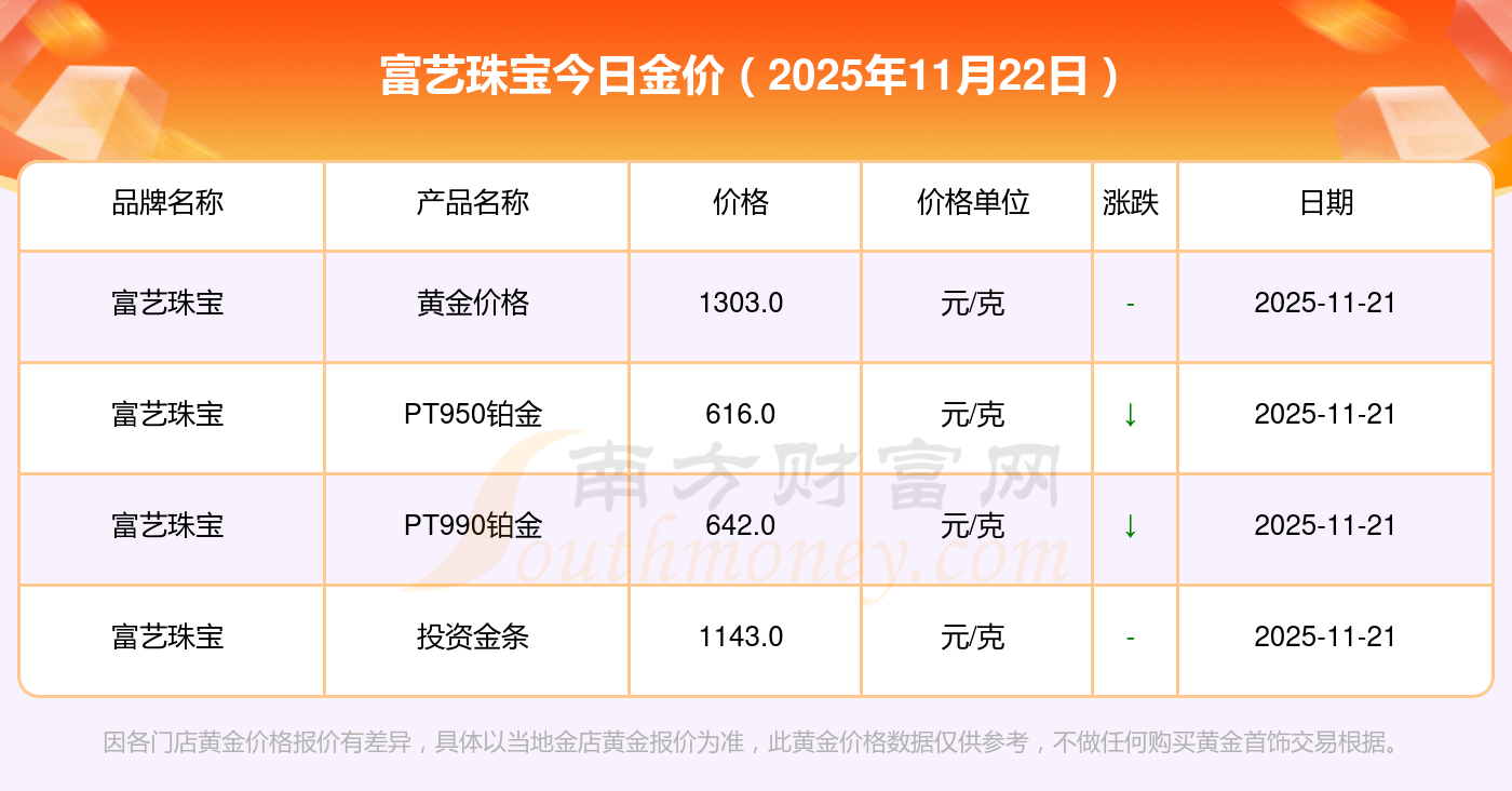 2025年11月22日富艺珠宝金价查询:黄金价格1305.0元/克,铂金价格616.0元/克,饰品金价(内地)1305.0元/克,黄金饰品(香港)45110.0,铂金价格(香港)17570.0,金条价格(香港)40690.0,金条金价(内地)1143.0元/克,黄金价格1298.0元/克,铂金价格600.0元/克,足金价格1298.0元/克,黄金价格1266.0元/克。