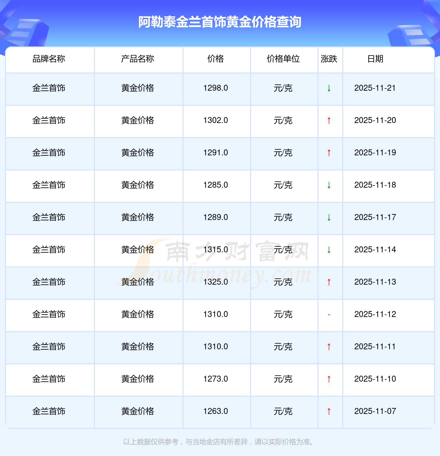2025年11月22日这一天,阿勒泰金兰首饰的黄金价格以 1298.0元/克的价格售卖。