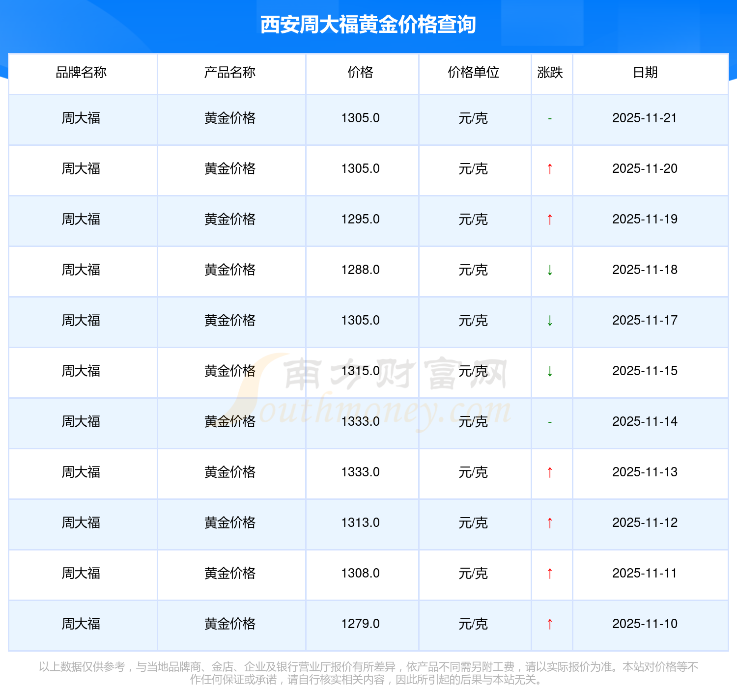 2025年11月22日当天,西安周大福黄金价格的单价是 1305.0元/克。