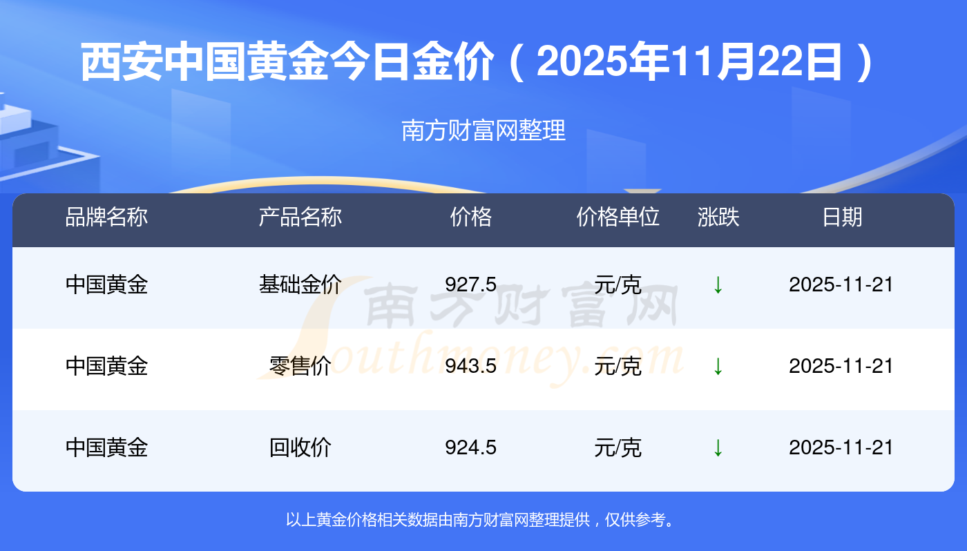 2025年11月22日西安中国黄金黄金的单价,一克为多少?黄金价格1305.0元/克,铂金价格616.0元/克,饰品金价(内地)1305.0元/克,黄金饰品(香港)45110.0,铂金价格(香港)17570.0,金条价格(香港)40690.0,金条金价(内地)1143.0元/克,黄金价格1298.0元/克,铂金价格600.0元/克,足金价格1298.0元/克,黄金价格1266.0元/克。