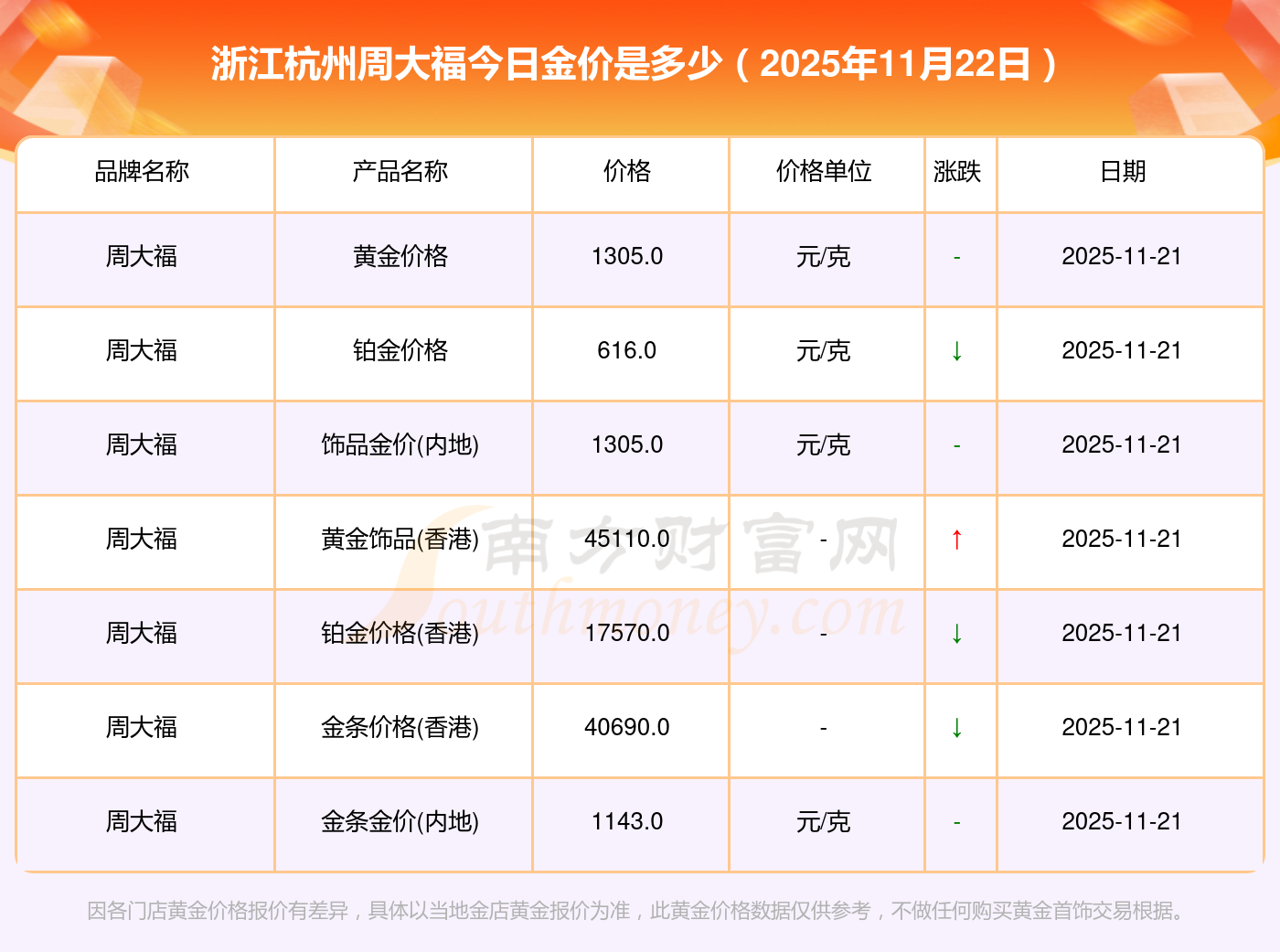 2025年11月22日浙江杭州周大福今日价格:黄金价格1305.0元/克,铂金价格616.0元/克,饰品金价(内地)1305.0元/克,黄金饰品(香港)45110.0,铂金价格(香港)17570.0,金条价格(香港)40690.0,金条金价(内地)1143.0元/克,黄金价格1298.0元/克,铂金价格600.0元/克,足金价格1298.0元/克,黄金价格1266.0元/克。