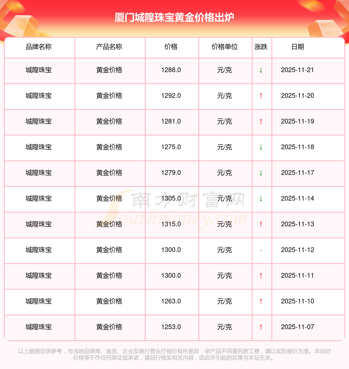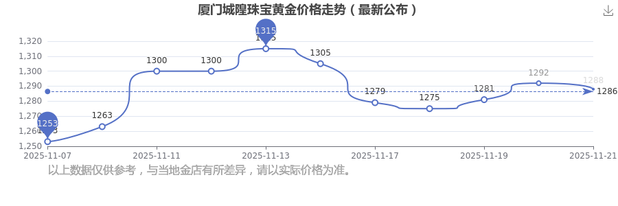 今日(2025年11月22日),厦门城隍珠宝黄金价格的价格是1288.0元/克。