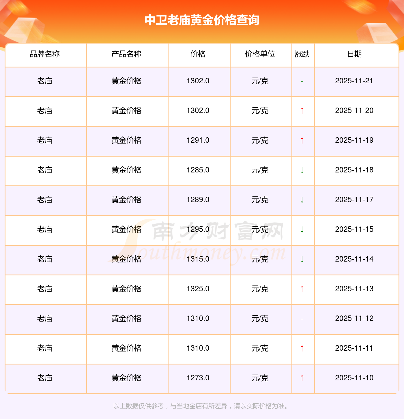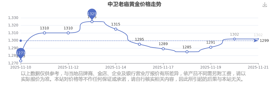 中卫老庙黄金价格在 2025年11月22日为 1302.0元/克。