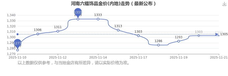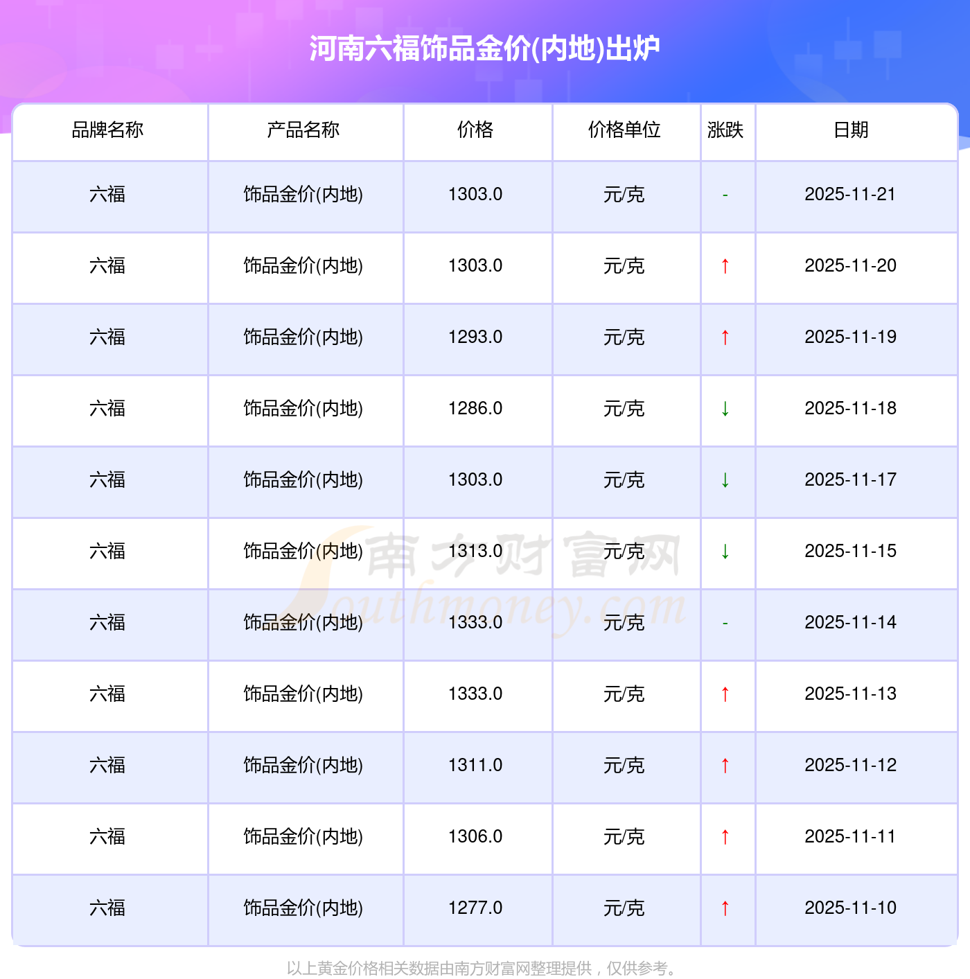 2025年11月22日,河南六福饰品金价(内地)每克的售卖价位为1303.0元/克。