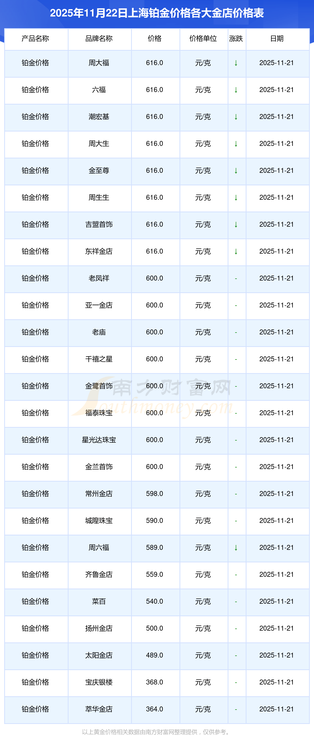 2025年11月22日上海各大金店铂金价格最新价格查询来了:周大福1305.0元/克,周大福616.0元/克,周大福1305.0元/克,周大福45110.0,周大福17570.0,周大福40690.0,周大福1143.0元/克,老凤祥1298.0元/克,老凤祥600.0元/克,老凤祥1298.0元/克,周六福1266.0元/克。