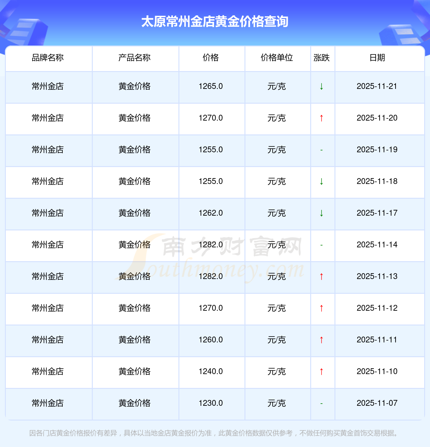 今日2025年11月22日,太原常州金店黄金价格为1265.0元/克。