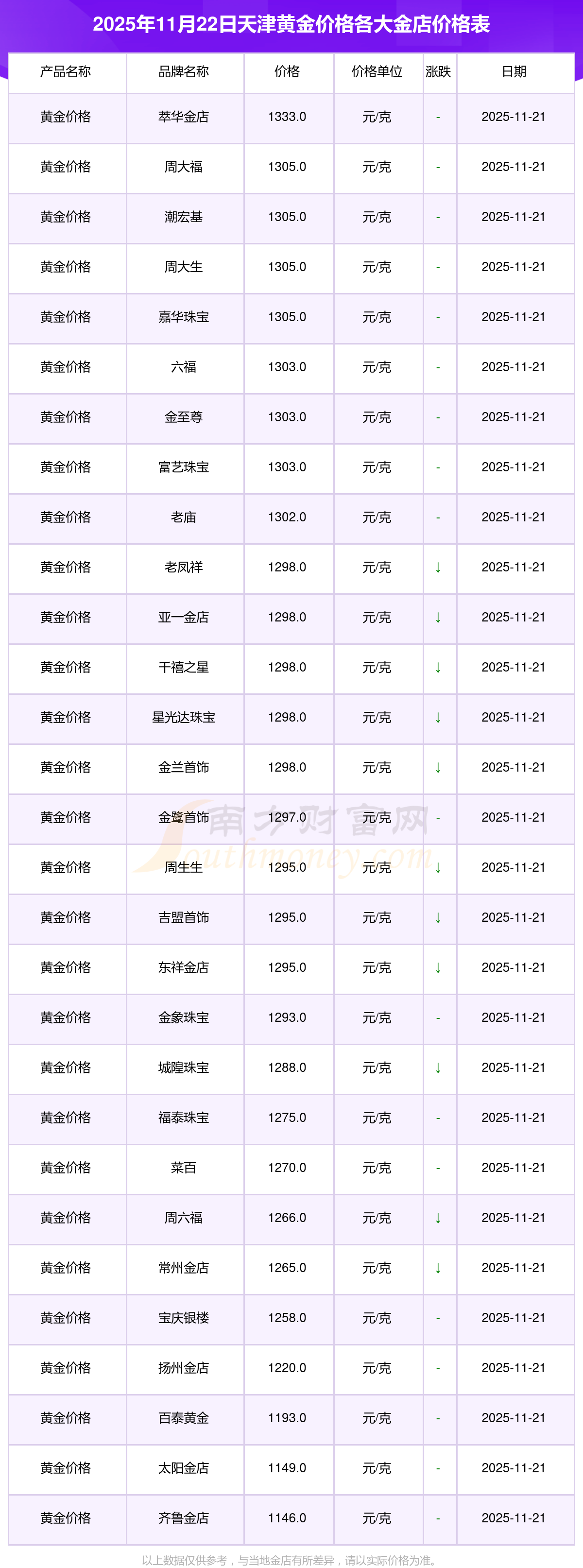 2025年11月22日天津周大福、周大福、周大福、周大福、周大福、周大福、周大福、老凤祥、老凤祥、老凤祥、周六福等各大金店品牌黄金价格最新价格行情来了,如下:周大福黄金价格1305.0元/克,周大福铂金价格616.0元/克,周大福饰品金价(内地)1305.0元/克,周大福黄金饰品(香港)45110.0,周大福铂金价格(香港)17570.0,周大福金条价格(香港)40690.0,周大福金条金价(内地)1143.0元/克,老凤祥黄金价格1298.0元/克,老凤祥铂金价格600.0元/克,老凤祥足金价格1298.0元/克,周六福黄金价格1266.0元/克。