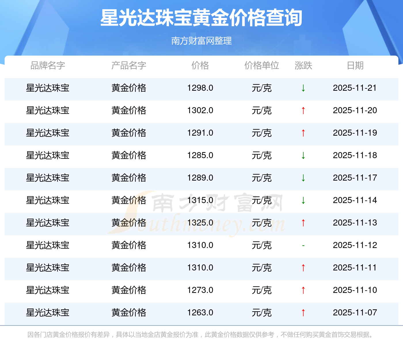今日黄金售价是多少呢?此刻每克黄金价钱怎样?黄金每一克的价位大概是多少呢?今日(2025年11月22日)星光达珠宝黄金价格为1298.0元/克。