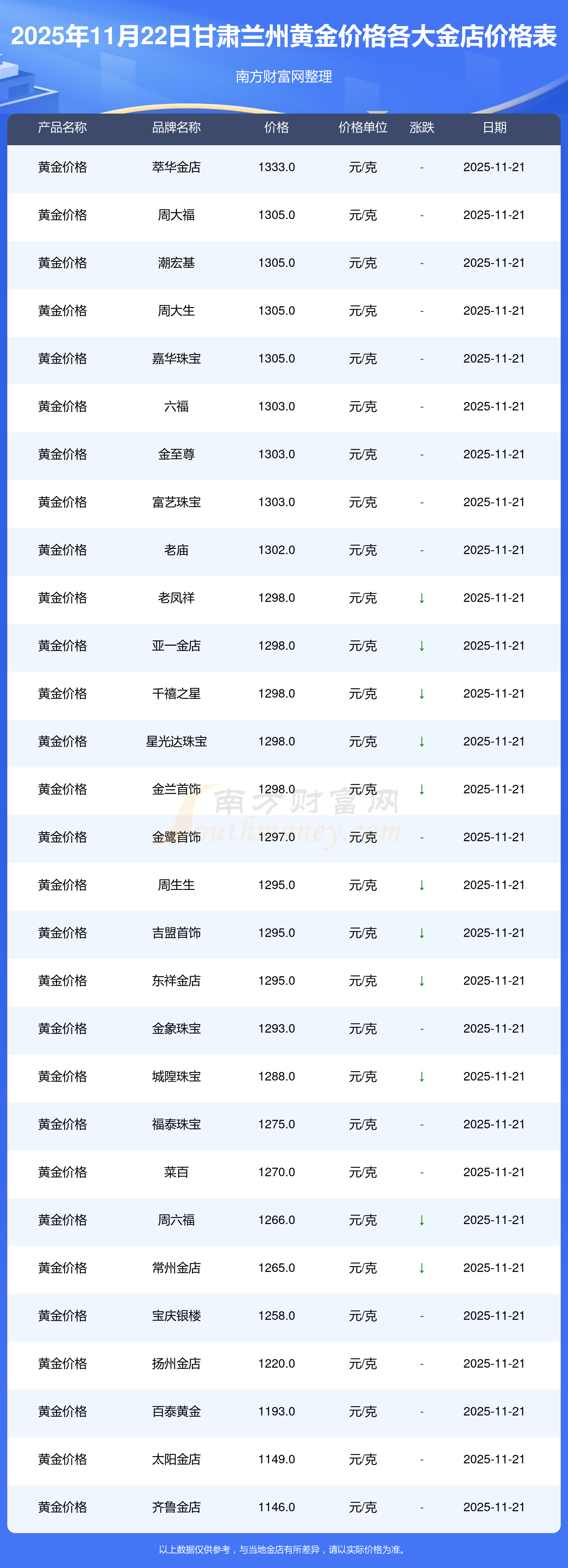 2025年11月22日甘肃兰州各大金店黄金价格最新价格查询来了:周大福1305.0元/克,周大福616.0元/克,周大福1305.0元/克,周大福45110.0,周大福17570.0,周大福40690.0,周大福1143.0元/克,老凤祥1298.0元/克,老凤祥600.0元/克,老凤祥1298.0元/克,周六福1266.0元/克。