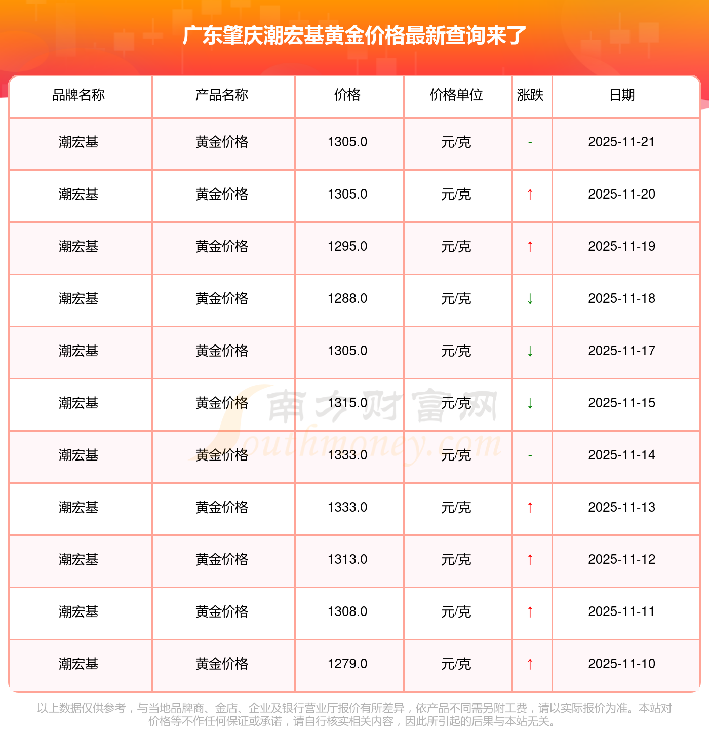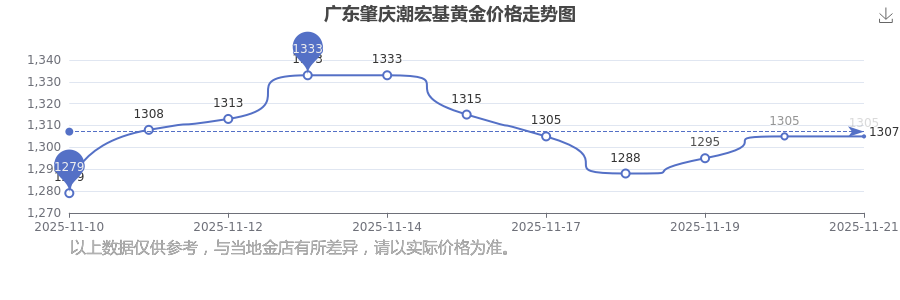 2025年11月22日当天,广东肇庆潮宏基黄金价格的单价是 1305.0元/克。