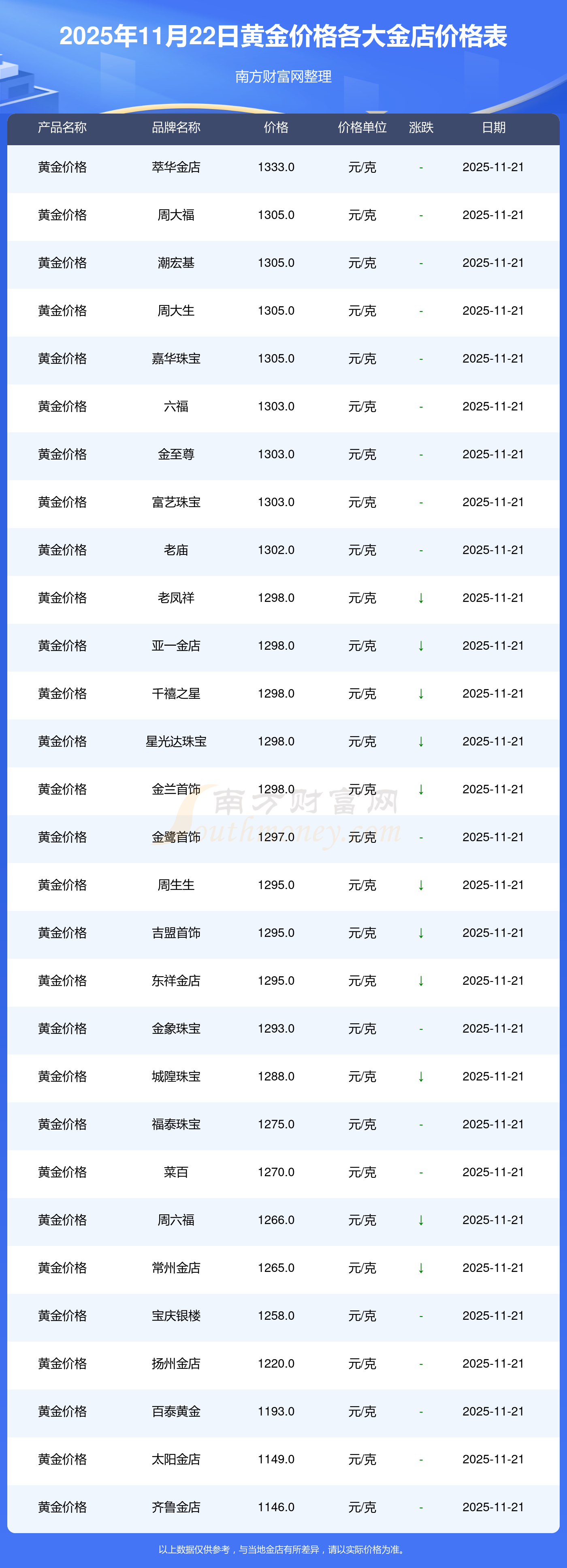 今天是2025年11月22日,周大福、周大福、周大福、周大福、周大福、周大福、周大福、老凤祥、老凤祥、老凤祥、周六福等各大金店品牌黄金价格最新价格如下:周大福1305.0元/克、周大福616.0元/克、周大福1305.0元/克、周大福45110.0、周大福17570.0、周大福40690.0、周大福1143.0元/克、老凤祥1298.0元/克、老凤祥600.0元/克、老凤祥1298.0元/克、周六福1266.0元/克。