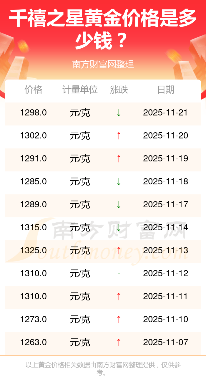 想查询今日黄金价格,当下黄金一克具体售价几何?一般情况下黄金每克的价位是多少左右?1298.0元/克的价格,是千禧之星今日 黄金价格的最新行情。