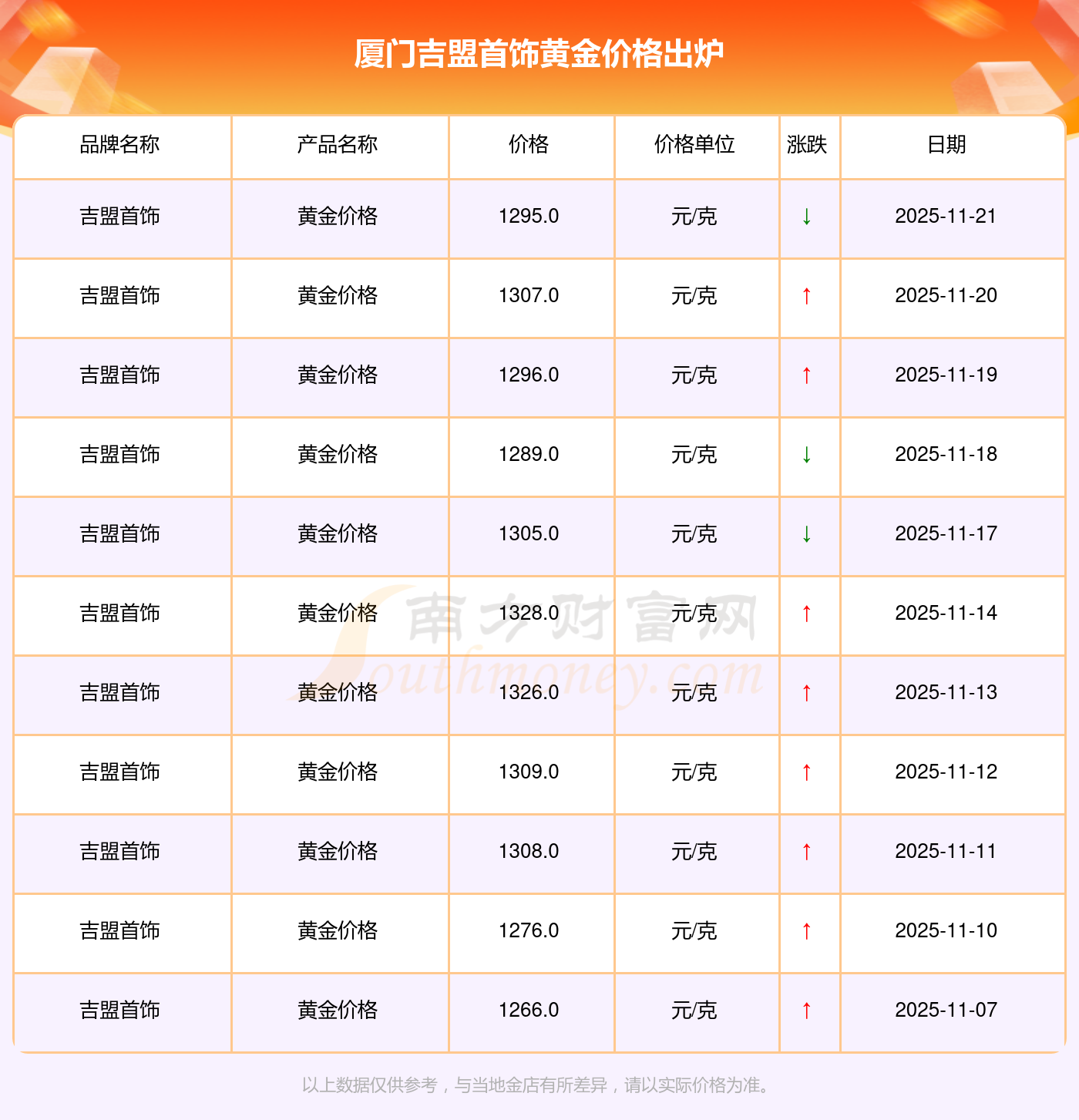 2025年11月22日,今日厦门吉盟首饰黄金价格:1295.0元/克。