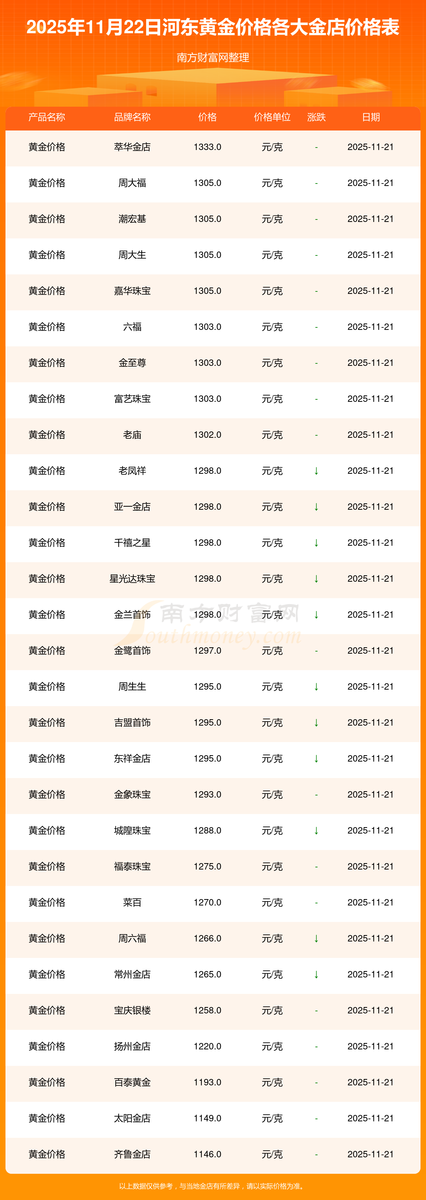 2025年11月22日,河东周大福、周大福、周大福、周大福、周大福、周大福、周大福、老凤祥、老凤祥、老凤祥、周六福等各大金店品牌黄金价格今日价格行情最新来了:周大福1305.0元/克、周大福616.0元/克、周大福1305.0元/克、周大福45110.0、周大福17570.0、周大福40690.0、周大福1143.0元/克、老凤祥1298.0元/克、老凤祥600.0元/克、老凤祥1298.0元/克、周六福1266.0元/克。