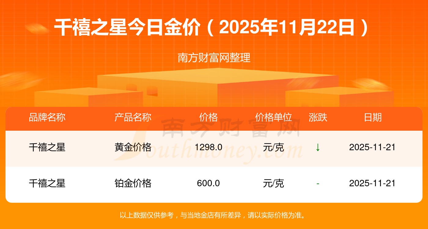 2025年11月22日,周大福、周大福、周大福、周大福、周大福、周大福、周大福、老凤祥、老凤祥、老凤祥、周六福等各大金店品牌黄金价格今日价格如下:周大福1305.0元/克、周大福616.0元/克、周大福1305.0元/克、周大福45110.0、周大福17570.0、周大福40690.0、周大福1143.0元/克、老凤祥1298.0元/克、老凤祥600.0元/克、老凤祥1298.0元/克、周六福1266.0元/克。
