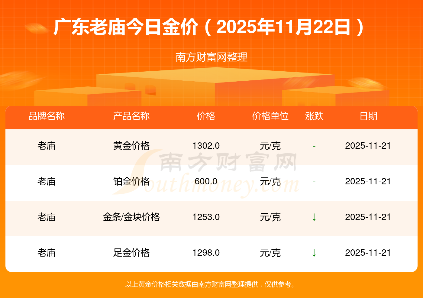 当下黄金每克的价格是多少呢?2025年11月22日广东老庙一克黄金对应的价格是多少?黄金价格1305.0元/克,铂金价格616.0元/克,饰品金价(内地)1305.0元/克,黄金饰品(香港)45110.0,铂金价格(香港)17570.0,金条价格(香港)40690.0,金条金价(内地)1143.0元/克,黄金价格1298.0元/克,铂金价格600.0元/克,足金价格1298.0元/克,黄金价格1266.0元/克。