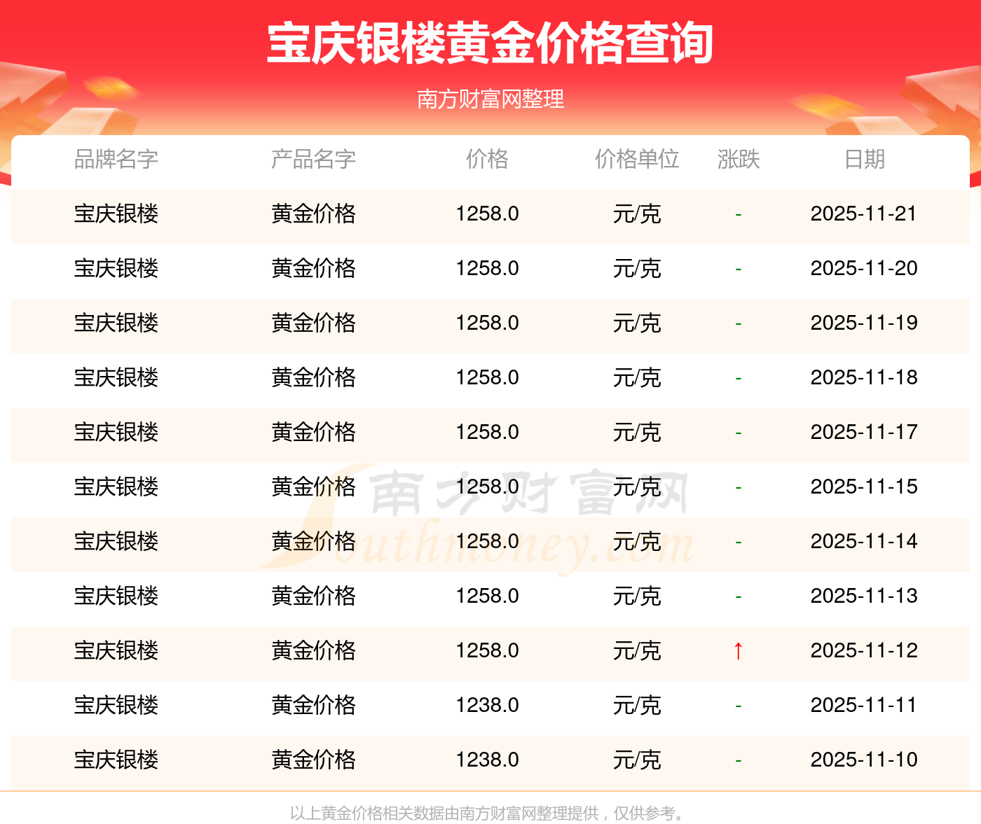 今日黄金价格具体多少?当下每克黄金值多少钱呢?作为优良的导电导热材料,黄金具备良好的导热特性。因为化学稳定性高、抗氧化性强,能制作高精度电子元件,所以在电子工业的特殊电路设计中经常使用它。今日(2025年11月22日),宝庆银楼黄金价格:1258.0元/克。