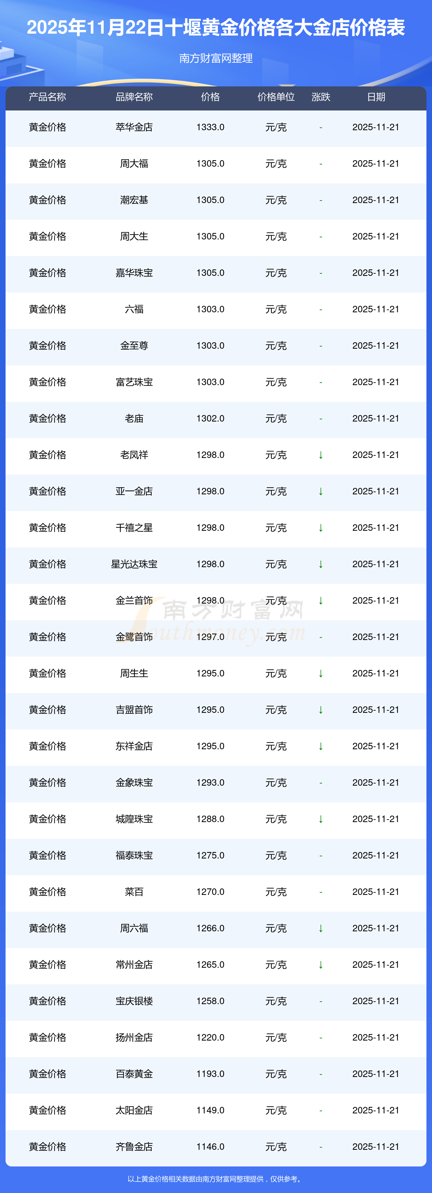 2025年11月22日,十堰周大福、周大福、周大福、周大福、周大福、周大福、周大福、老凤祥、老凤祥、老凤祥、周六福等各大金店品牌黄金价格今日价格行情最新来了:周大福1305.0元/克、周大福616.0元/克、周大福1305.0元/克、周大福45110.0、周大福17570.0、周大福40690.0、周大福1143.0元/克、老凤祥1298.0元/克、老凤祥600.0元/克、老凤祥1298.0元/克、周六福1266.0元/克。
