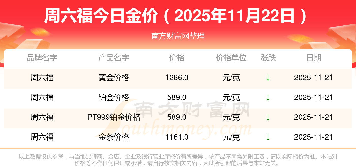 今天是2025年11月22日,周大福、周大福、周大福、周大福、周大福、周大福、周大福、老凤祥、老凤祥、老凤祥、周六福等各大金店品牌黄金价格最新价格如下:周大福1305.0元/克、周大福616.0元/克、周大福1305.0元/克、周大福45110.0、周大福17570.0、周大福40690.0、周大福1143.0元/克、老凤祥1298.0元/克、老凤祥600.0元/克、老凤祥1298.0元/克、周六福1266.0元/克。
