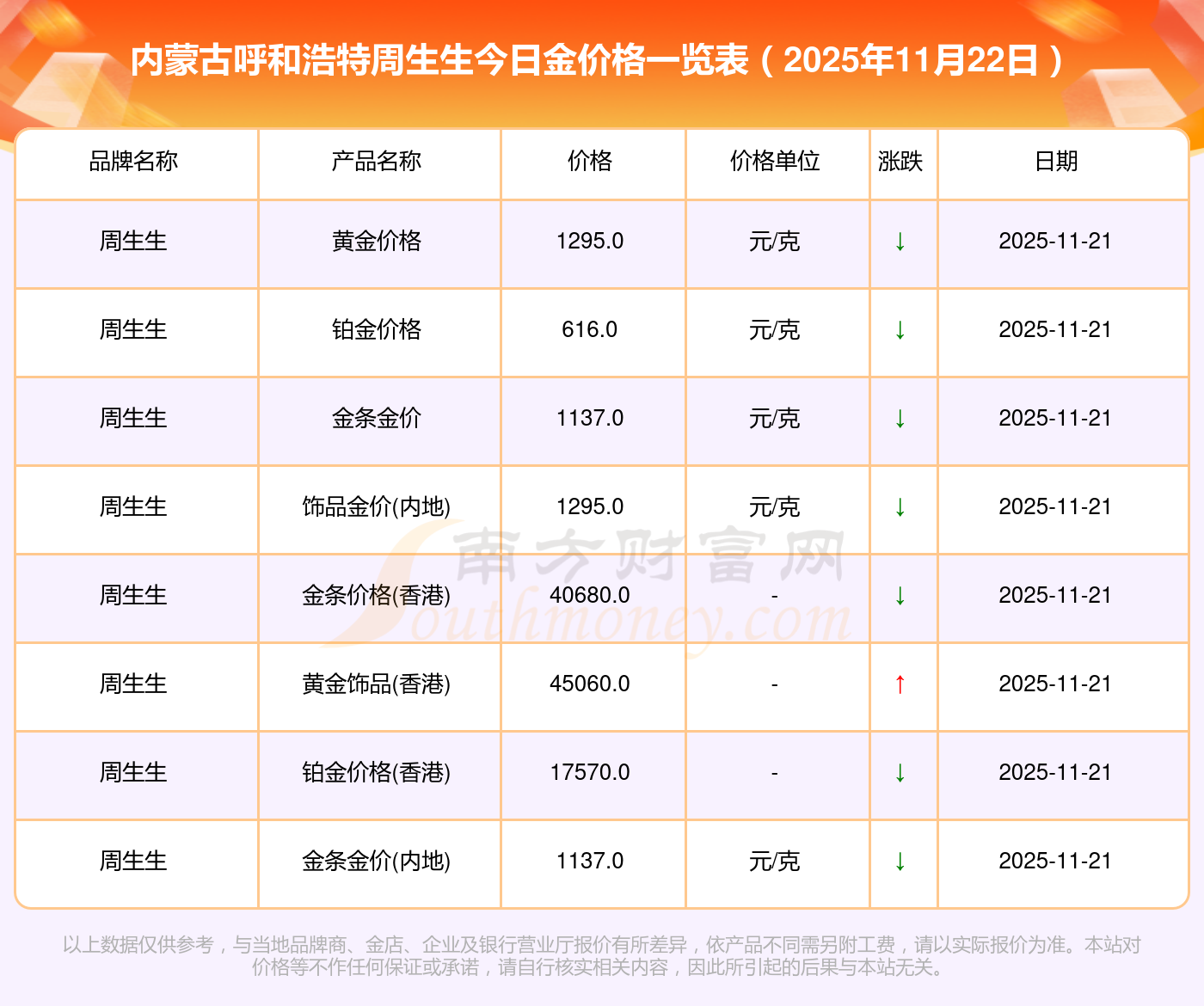 黄金价格1305.0元/克,铂金价格616.0元/克,饰品金价(内地)1305.0元/克,黄金饰品(香港)45110.0,铂金价格(香港)17570.0,金条价格(香港)40690.0,金条金价(内地)1143.0元/克,黄金价格1298.0元/克,铂金价格600.0元/克,足金价格1298.0元/克,黄金价格1266.0元/克。
