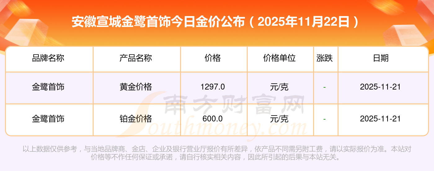 2025年11月22日安徽宣城金鹭首饰一克黄金的售价是多少:黄金价格1305.0元/克,铂金价格616.0元/克,饰品金价(内地)1305.0元/克,黄金饰品(香港)45110.0,铂金价格(香港)17570.0,金条价格(香港)40690.0,金条金价(内地)1143.0元/克,黄金价格1298.0元/克,铂金价格600.0元/克,足金价格1298.0元/克,黄金价格1266.0元/克。