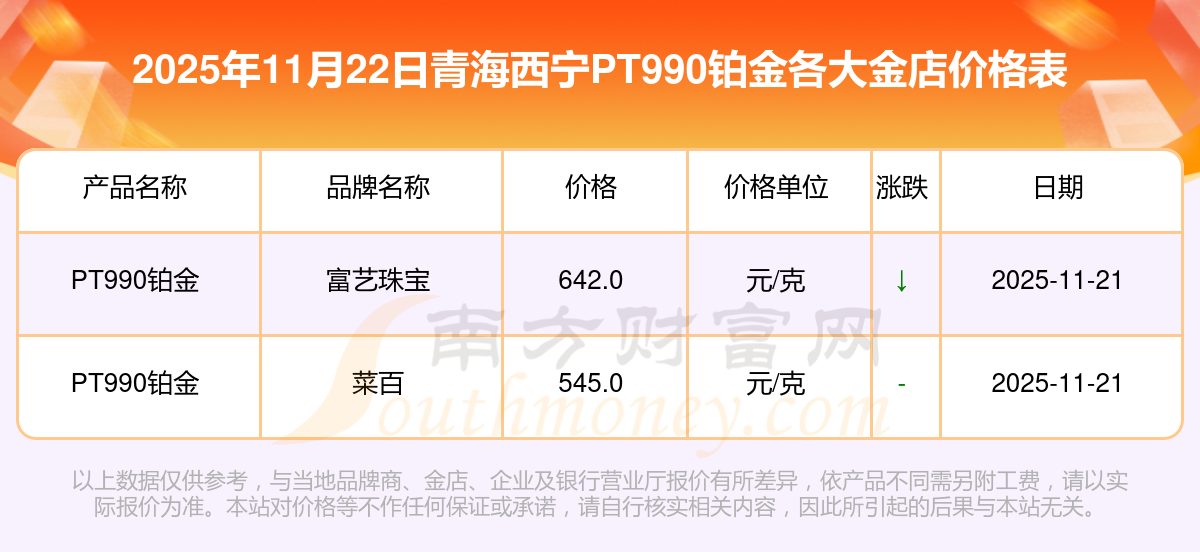 今日青海西宁PT990铂金最低的金店是菜百,报价545.0元/克,最高的是富艺珠宝,报价642.0元/克。今日PT990铂金高低差为97元/克。