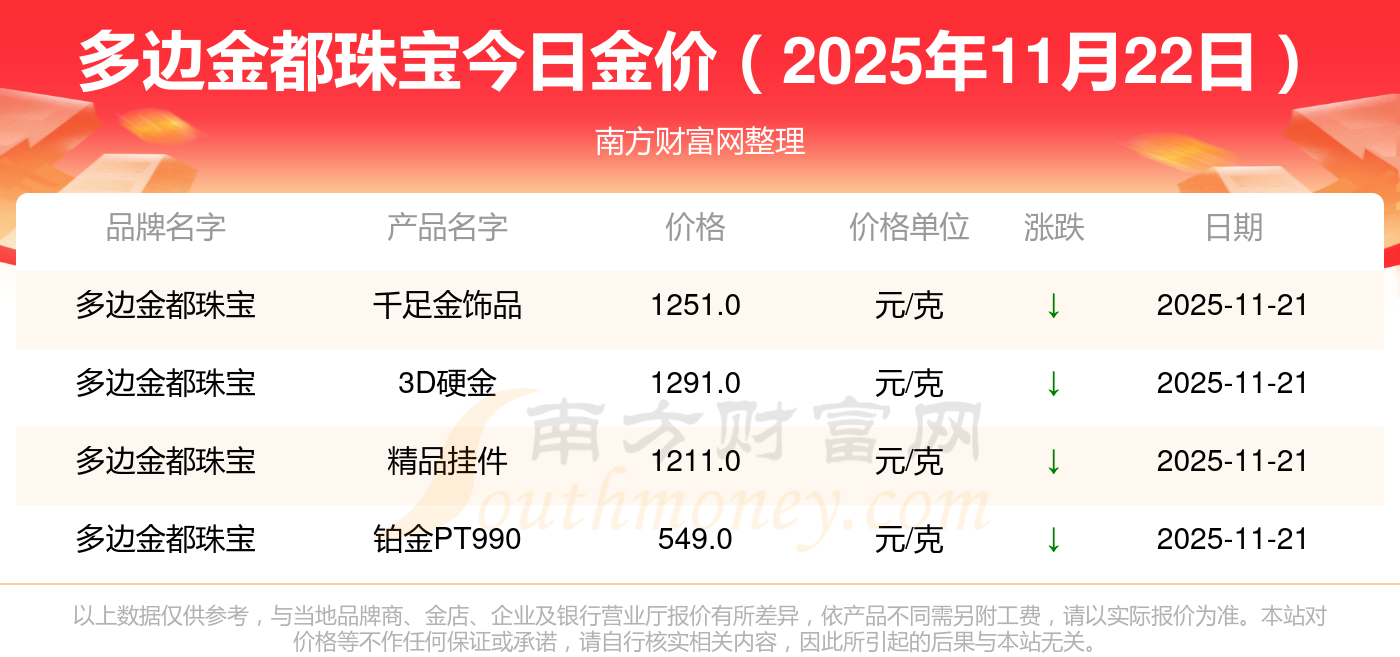 多边金都珠宝今日黄金价格行情如何:黄金价格1305.0元/克,铂金价格616.0元/克,饰品金价(内地)1305.0元/克,黄金饰品(香港)45110.0,铂金价格(香港)17570.0,金条价格(香港)40690.0,金条金价(内地)1143.0元/克,黄金价格1298.0元/克,铂金价格600.0元/克,足金价格1298.0元/克,黄金价格1266.0元/克。