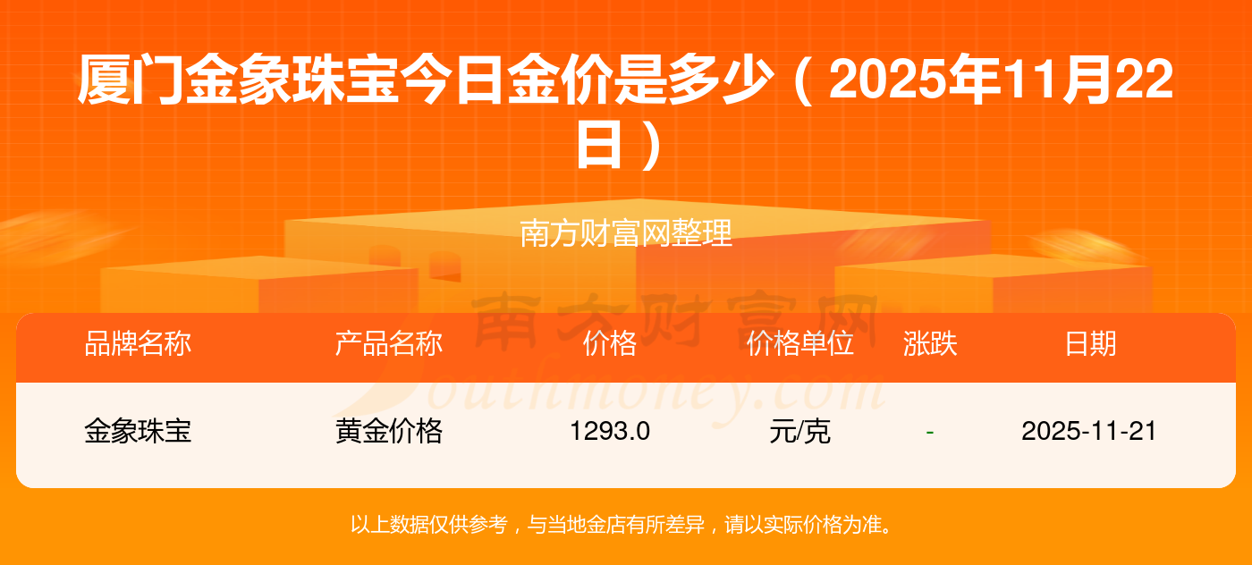 今日黄金售价是多少呢?此刻每克黄金价钱怎样?2025年11月22日厦门金象珠宝金价查询:黄金价格1305.0元/克,铂金价格616.0元/克,饰品金价(内地)1305.0元/克,黄金饰品(香港)45110.0,铂金价格(香港)17570.0,金条价格(香港)40690.0,金条金价(内地)1143.0元/克,黄金价格1298.0元/克,铂金价格600.0元/克,足金价格1298.0元/克,黄金价格1266.0元/克。