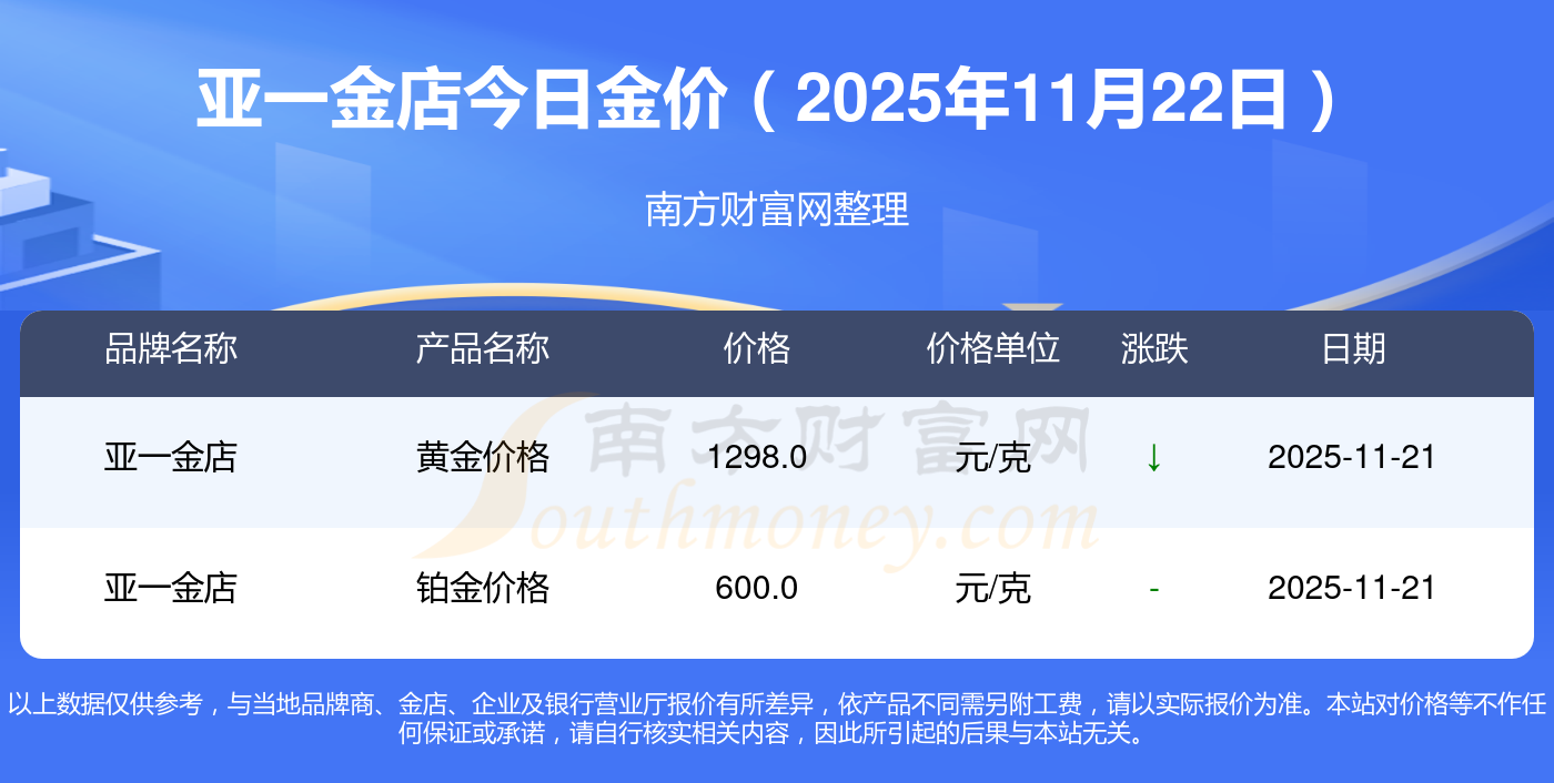 现在亚一金店黄金价格是多少钱1克_2025年亚一金店今日金价是多少钱一克,最新亚一金店查询,2025年11月22日亚一金店黄金价格现在每克多少钱?最新亚一金店黄金价格报价公布,一起来看看吧!