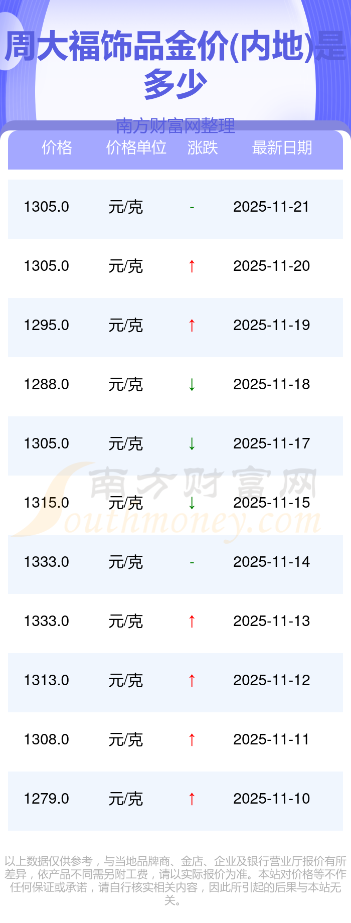 目前周大福 饰品金价(内地)的价格,今日最新为1305.0元/克。