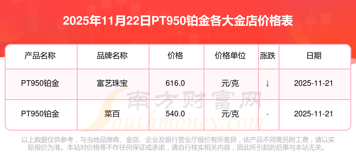 2025年11月22日周大福、周大福、周大福、周大福、周大福、周大福、周大福、老凤祥、老凤祥、老凤祥、周六福等各大金店品牌PT950铂金最新价格如下:周大福黄金价格1305.0元/克,周大福铂金价格616.0元/克,周大福饰品金价(内地)1305.0元/克,周大福黄金饰品(香港)45110.0,周大福铂金价格(香港)17570.0,周大福金条价格(香港)40690.0,周大福金条金价(内地)1143.0元/克,老凤祥黄金价格1298.0元/克,老凤祥铂金价格600.0元/克,老凤祥足金价格1298.0元/克,周六福黄金价格1266.0元/克。