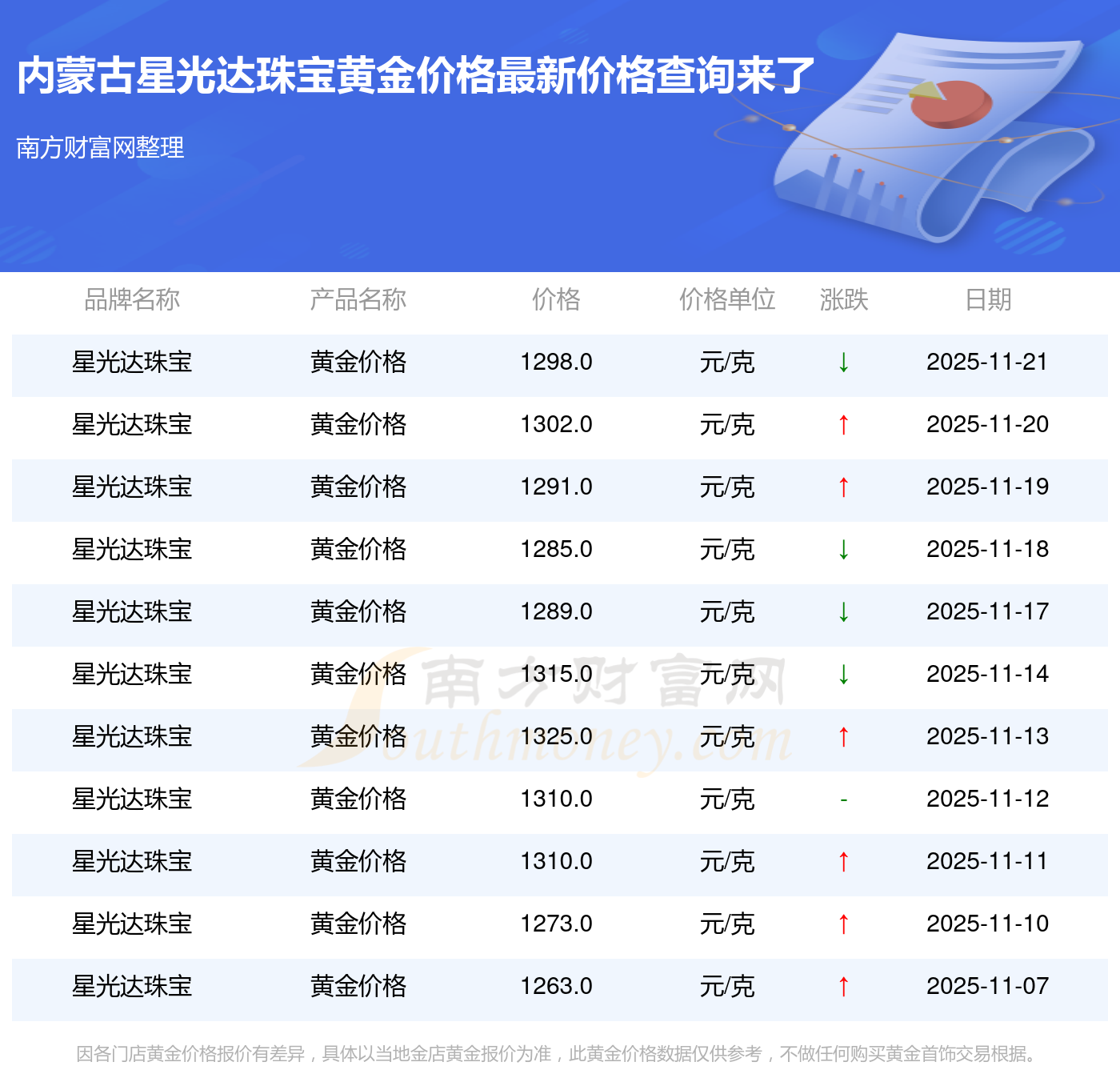 今日(2025年11月22日)内蒙古星光达珠宝黄金价格是1298.0元/克。
