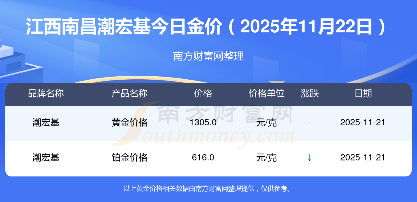 2025年11月22日江西南昌潮宏基一克黄金对应的价格是多少?黄金价格1305.0元/克,铂金价格616.0元/克,饰品金价(内地)1305.0元/克,黄金饰品(香港)45110.0,铂金价格(香港)17570.0,金条价格(香港)40690.0,金条金价(内地)1143.0元/克,黄金价格1298.0元/克,铂金价格600.0元/克,足金价格1298.0元/克,黄金价格1266.0元/克。