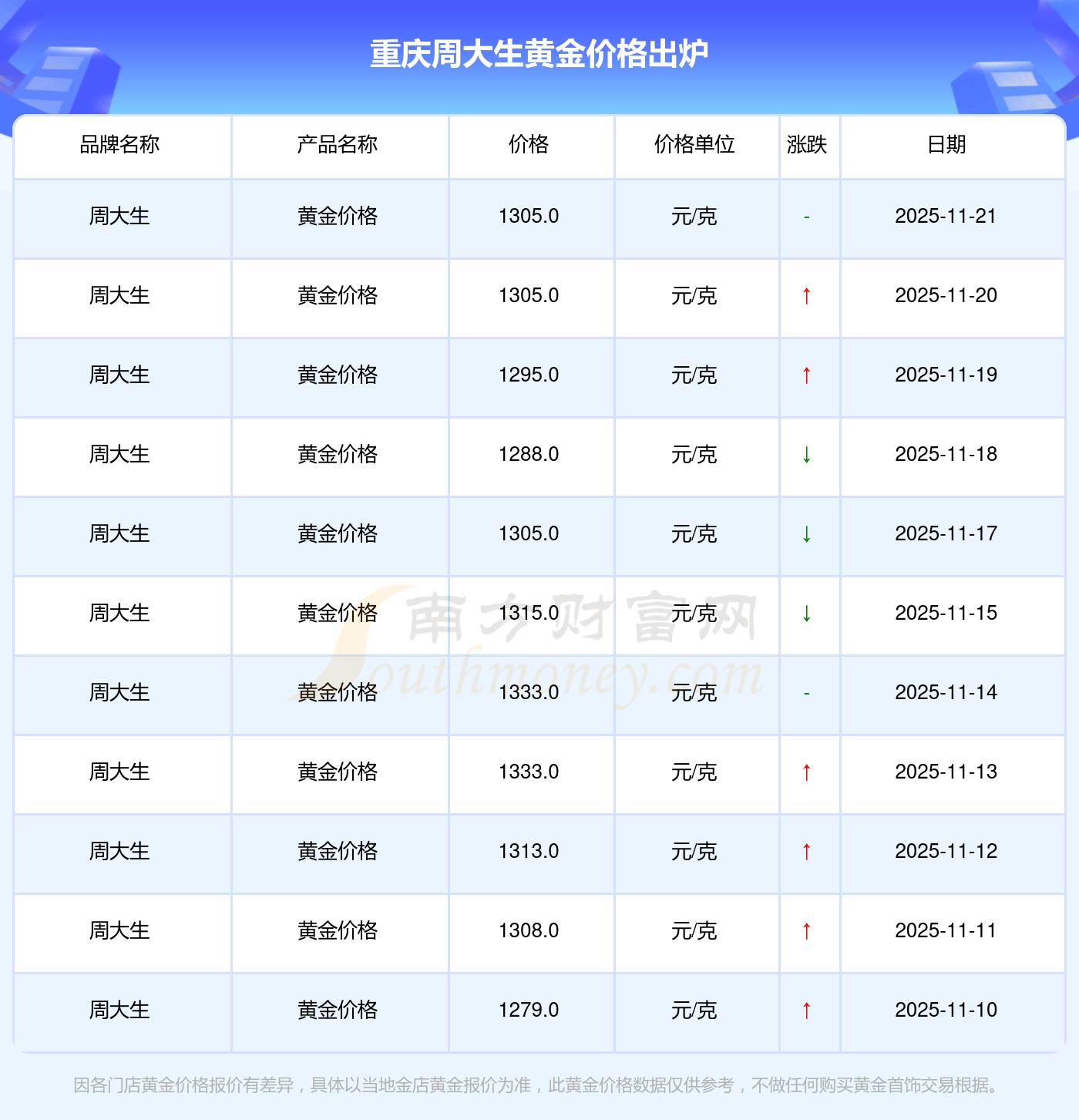 今日重庆周大生黄金价格的价格为1305.0元/克。