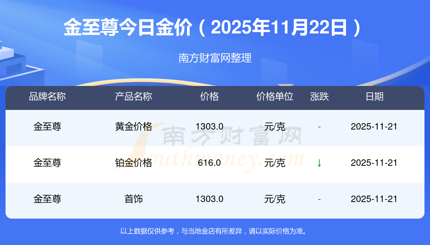 今天是2025年11月22日,周大福、周大福、周大福、周大福、周大福、周大福、周大福、老凤祥、老凤祥、老凤祥、周六福等各大金店品牌黄金价格最新价格如下:周大福1305.0元/克、周大福616.0元/克、周大福1305.0元/克、周大福45110.0、周大福17570.0、周大福40690.0、周大福1143.0元/克、老凤祥1298.0元/克、老凤祥600.0元/克、老凤祥1298.0元/克、周六福1266.0元/克。
