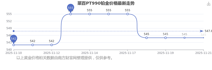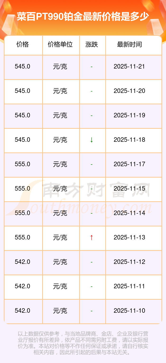 2025年11月22日菜百PT990铂金价格最新为545.0元/克。