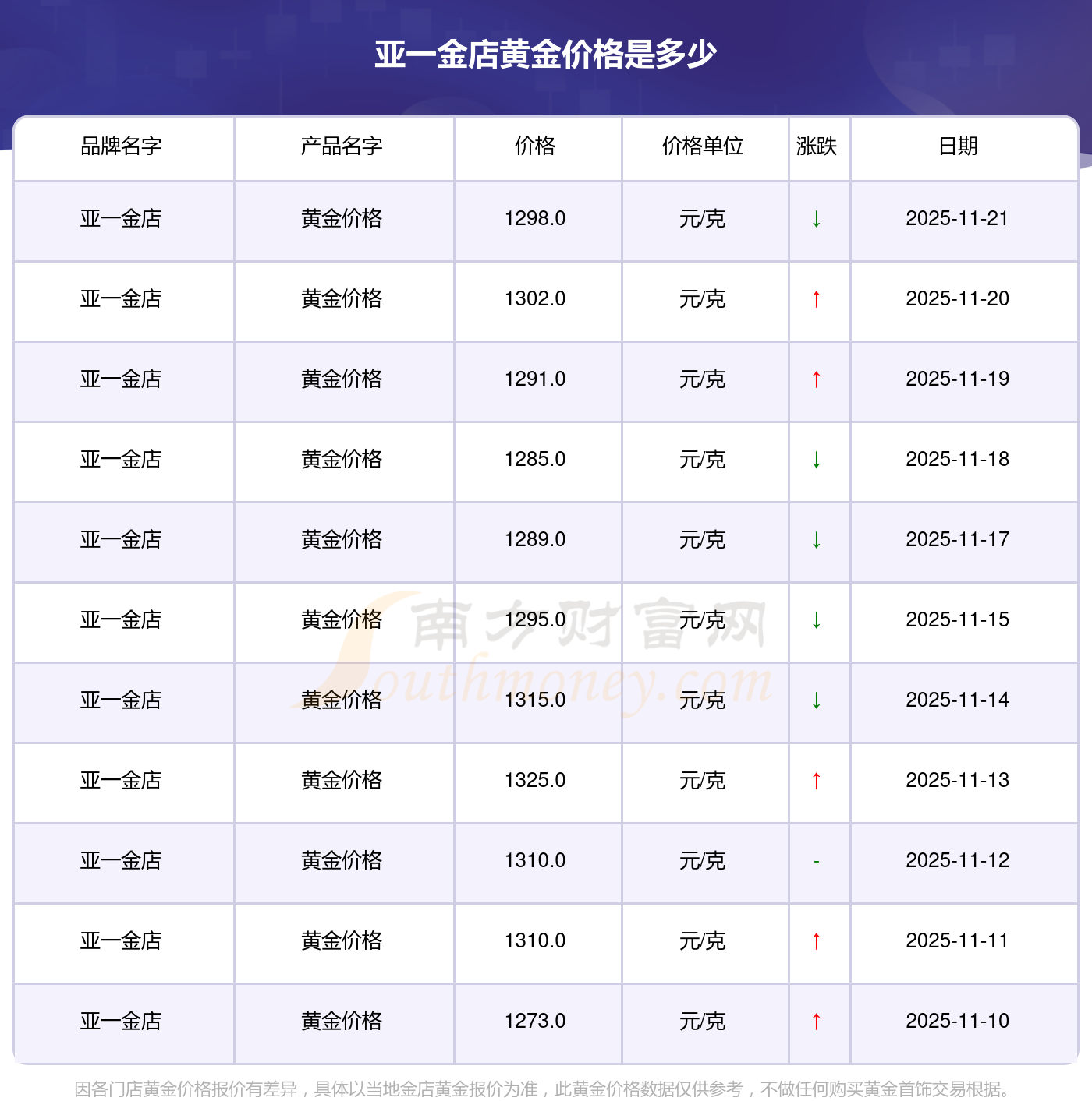 以上数据仅供参考,与当地品牌商、金店、企业及银行营业厅报价有所差异,依产品不同需另附工费,请以实际报价为准。本站对价格等不作任何保证或承诺,请自行核实相关内容,因此所引起的后果与本站无关。