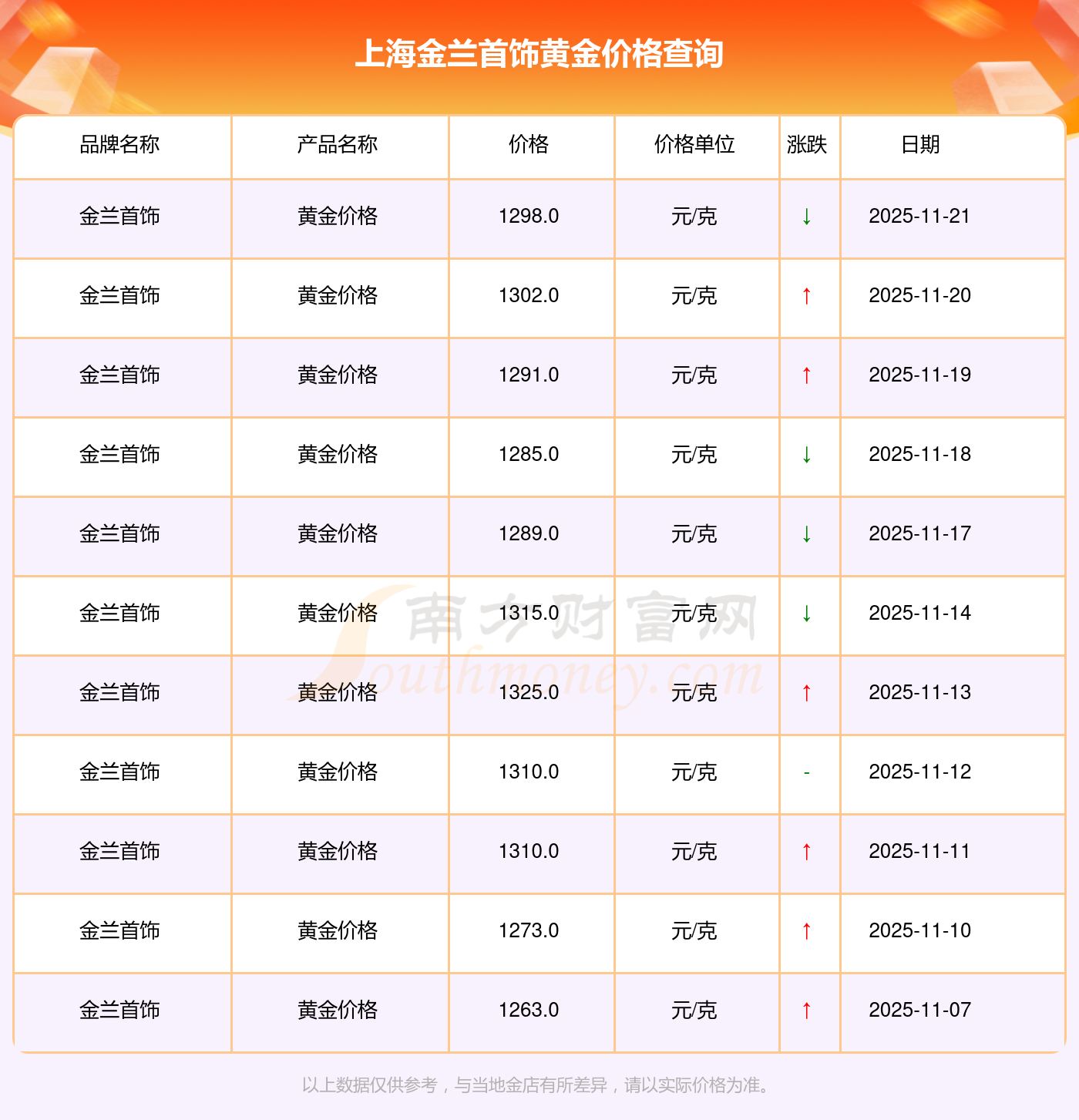 2025年11月22日各大金店黄金价格最新价格:周大福1305.0元/克,周大福616.0元/克,周大福1305.0元/克,周大福45110.0,周大福17570.0,周大福40690.0,周大福1143.0元/克,老凤祥1298.0元/克,老凤祥600.0元/克,老凤祥1298.0元/克,周六福1266.0元/克。