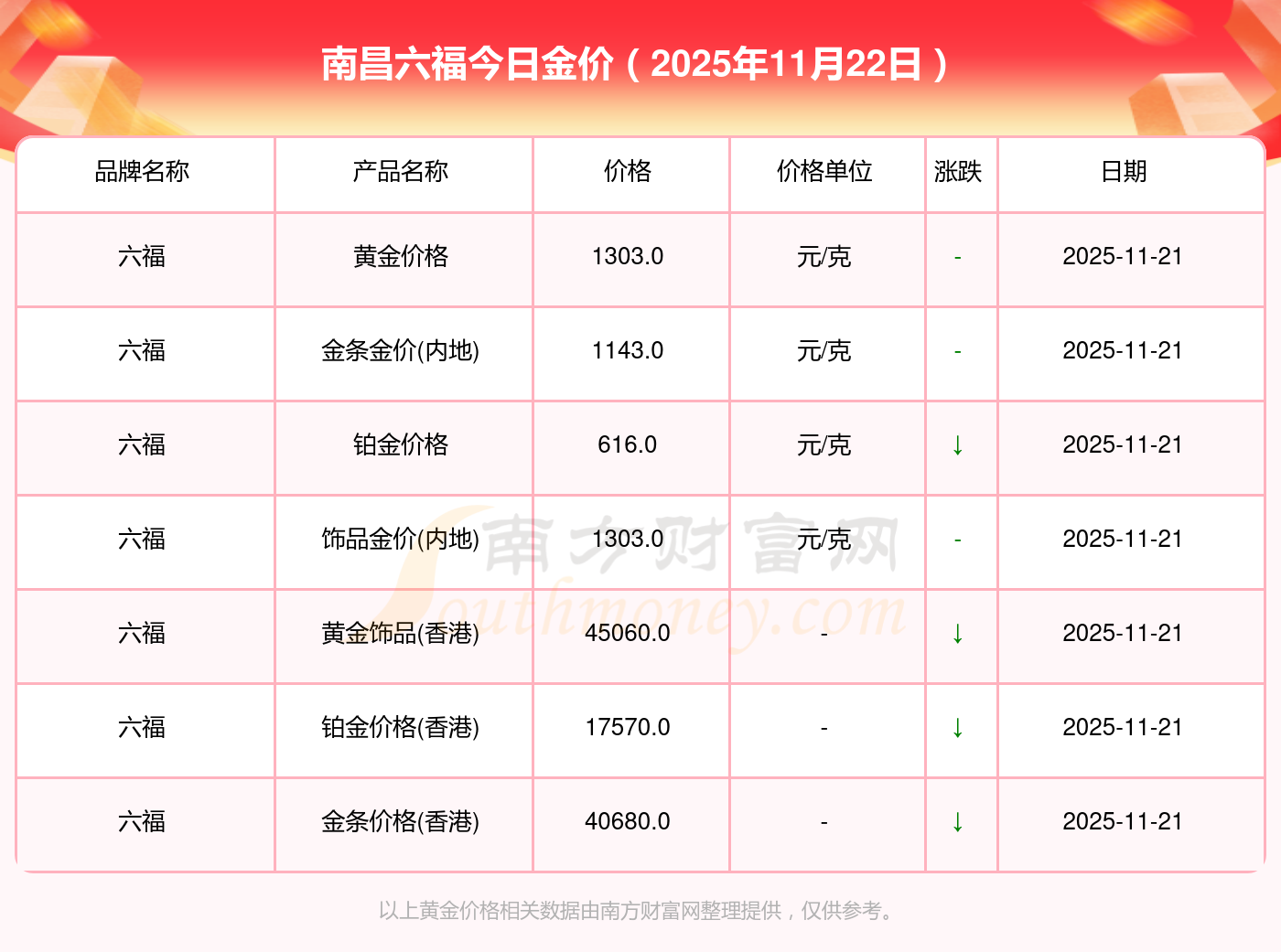 2025年11月22日南昌六福最新价格:黄金价格1305.0元/克,铂金价格616.0元/克,饰品金价(内地)1305.0元/克,黄金饰品(香港)45110.0,铂金价格(香港)17570.0,金条价格(香港)40690.0,金条金价(内地)1143.0元/克,黄金价格1298.0元/克,铂金价格600.0元/克,足金价格1298.0元/克,黄金价格1266.0元/克。