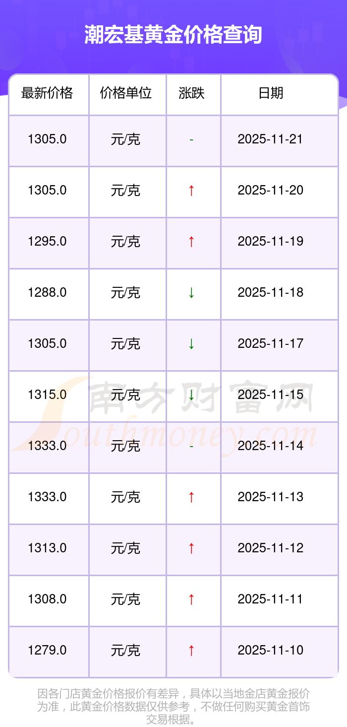 想知道当下黄金价格,今天黄金一克卖多少钱呢?平常,一克黄金的售价大概在多少范围?今日潮宏基 黄金价格,最新确定为1305.0元/克。