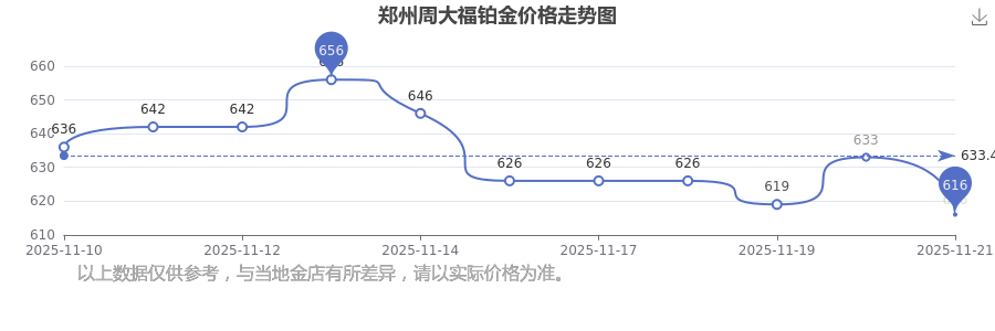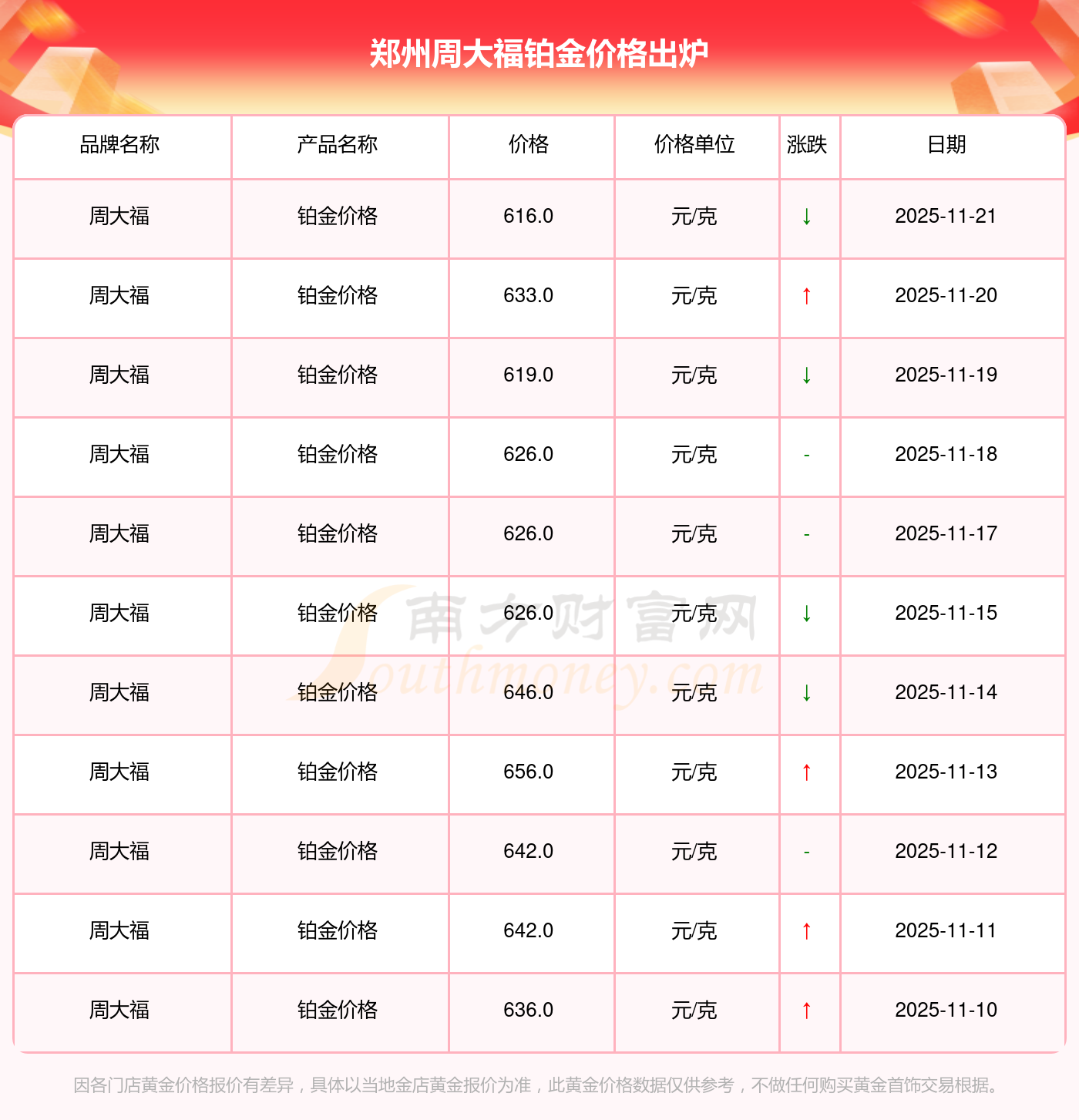 2025年11月22日,今日郑州周大福铂金价格:616.0元/克。