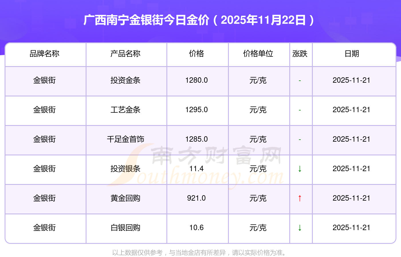 2025年11月22日广西南宁金银街今日价格:黄金价格1305.0元/克,铂金价格616.0元/克,饰品金价(内地)1305.0元/克,黄金饰品(香港)45110.0,铂金价格(香港)17570.0,金条价格(香港)40690.0,金条金价(内地)1143.0元/克,黄金价格1298.0元/克,铂金价格600.0元/克,足金价格1298.0元/克,黄金价格1266.0元/克。