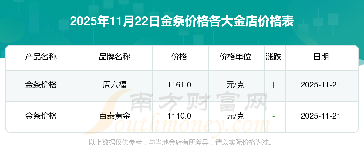 2025年11月22日各大金店金条价格最新价格:周大福1305.0元/克,周大福616.0元/克,周大福1305.0元/克,周大福45110.0,周大福17570.0,周大福40690.0,周大福1143.0元/克,老凤祥1298.0元/克,老凤祥600.0元/克,老凤祥1298.0元/克,周六福1266.0元/克。