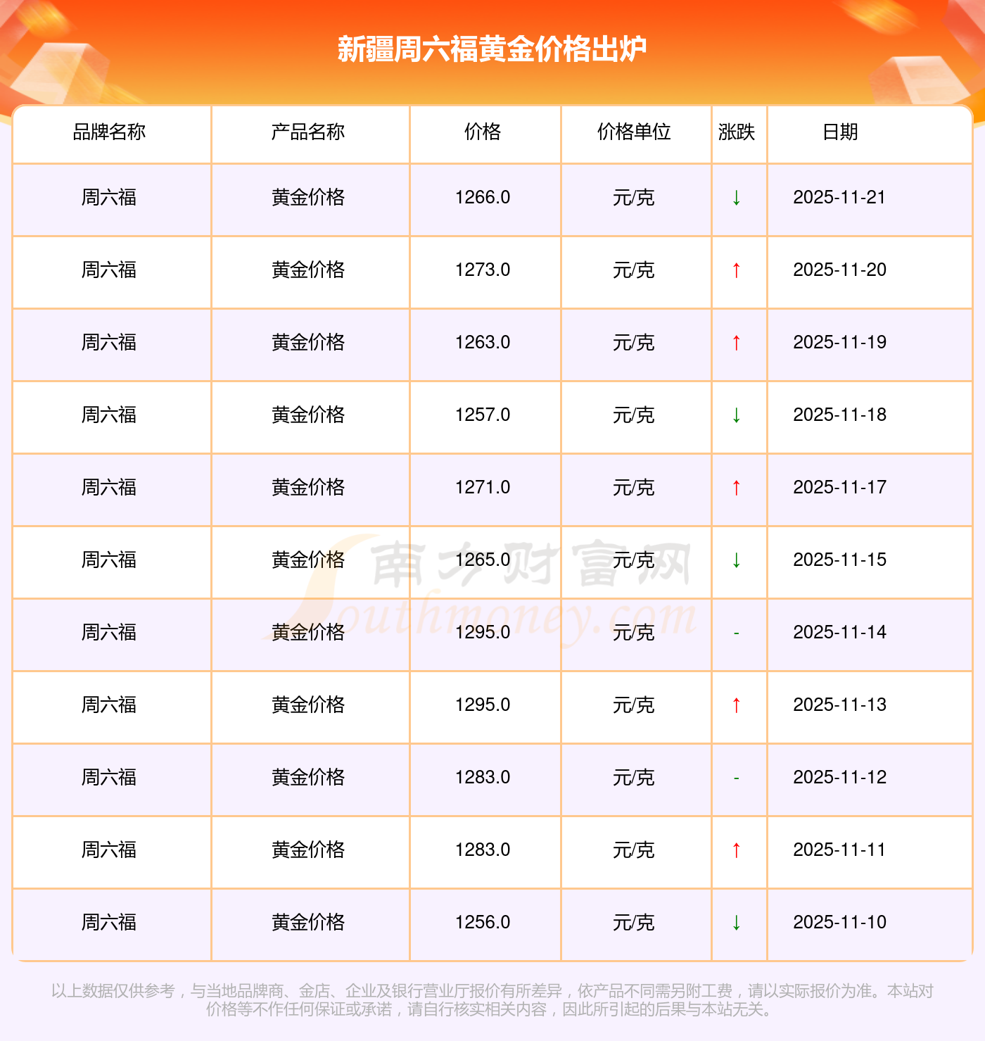 2025年11月22日,新疆周六福所售黄金价格,其价格设定为 1266.0元/克。