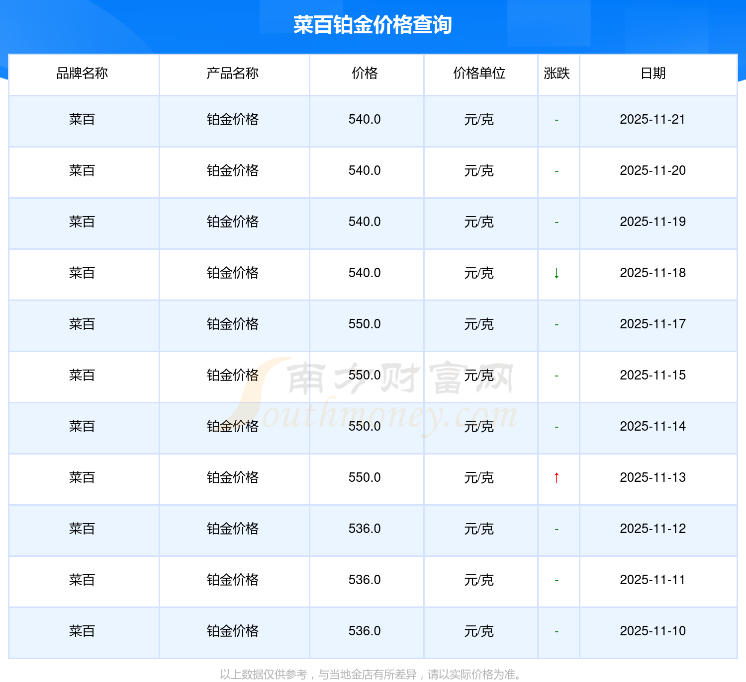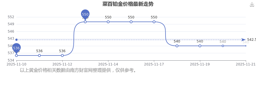 今日菜百 铂金价格最新的市场标价为540.0元/克。