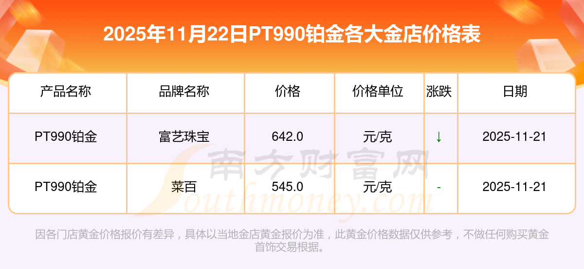 PT990铂金最高的金店是富艺珠宝,报价642.0元/克,最低的是菜百,报价545.0元/克。今日PT990铂金高低差为97元/克。