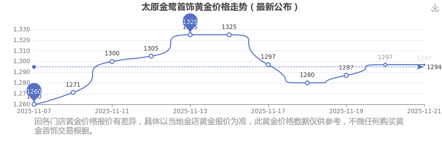 2025年11月22日,太原金鹭首饰黄金价格每克的售卖价位为1297.0元/克。