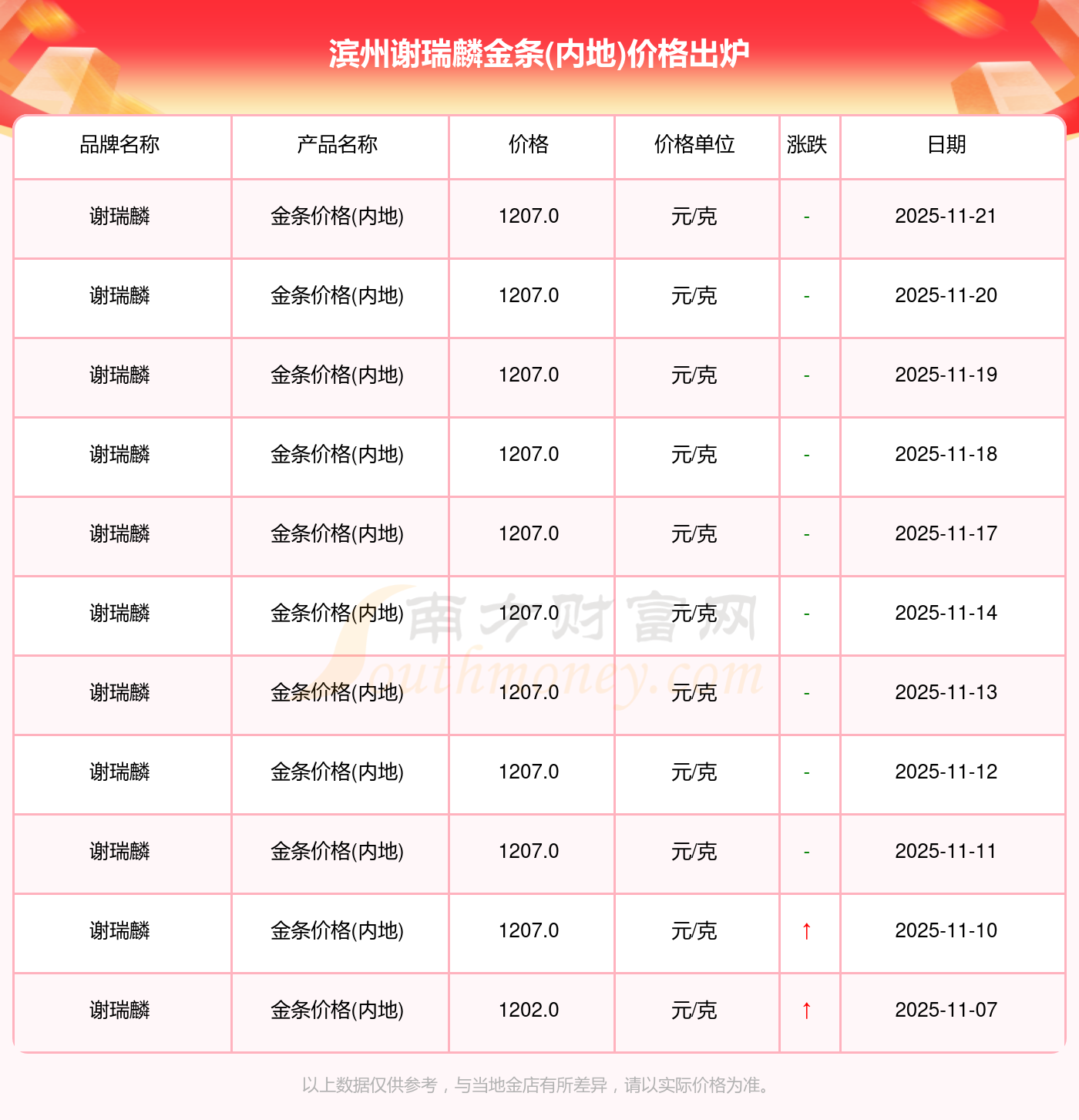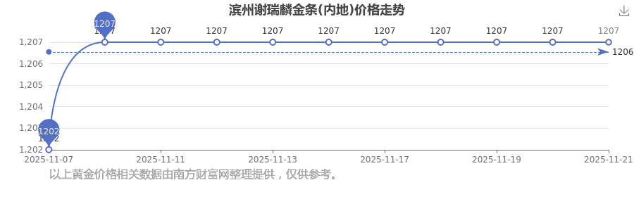 2025年11月22日,滨州谢瑞麟金条价格(内地)每克的售卖价位为1207.0元/克。