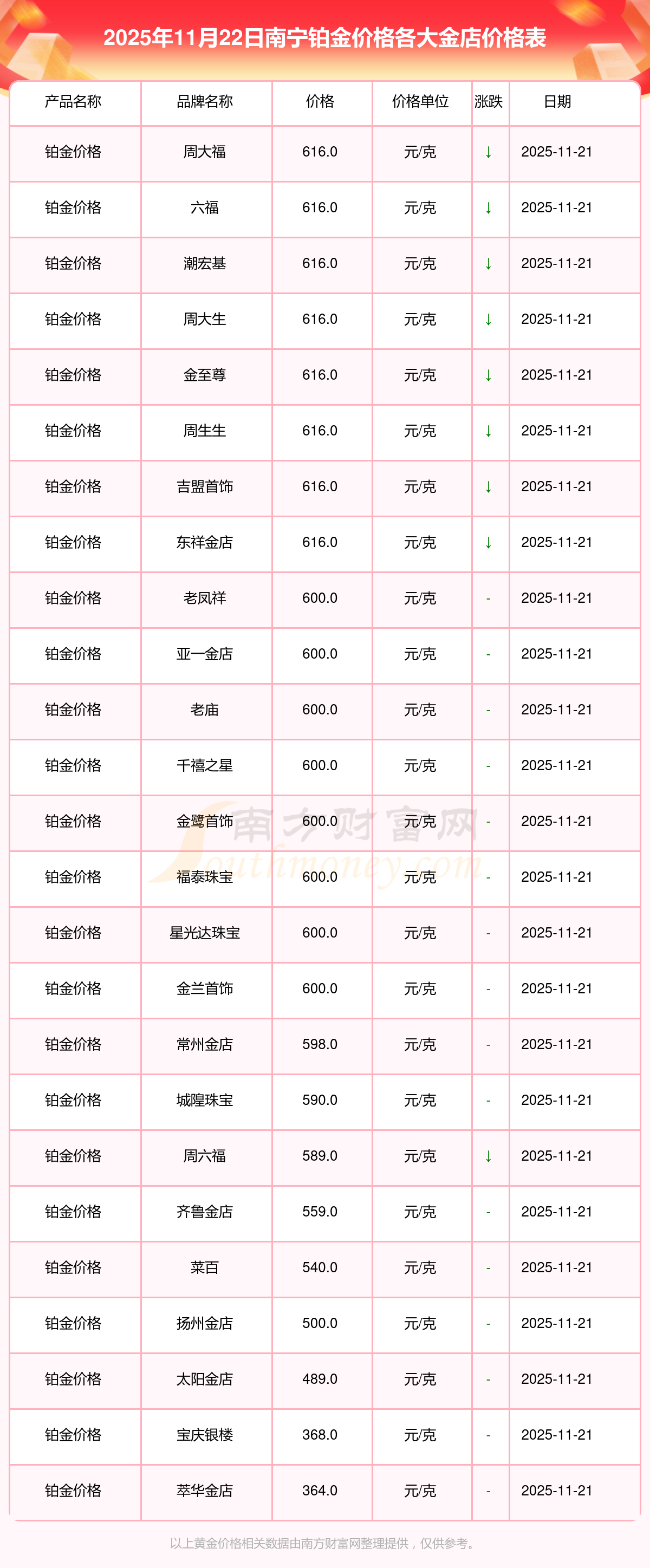2025年11月22日,南宁周大福、周大福、周大福、周大福、周大福、周大福、周大福、老凤祥、老凤祥、老凤祥、周六福等各大金店品牌铂金价格今日价格行情最新来了:周大福1305.0元/克、周大福616.0元/克、周大福1305.0元/克、周大福45110.0、周大福17570.0、周大福40690.0、周大福1143.0元/克、老凤祥1298.0元/克、老凤祥600.0元/克、老凤祥1298.0元/克、周六福1266.0元/克。